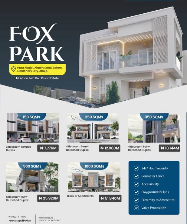 Welcome to Fox Park, a premium development located along Airport Road, before Centenary City, Abuja — the site of Africa’s first Polo Golf Resort Estate. Designed for comfort, class, and convenience, Fox Park offers well-planned residential plots for modern homes and smart investors.