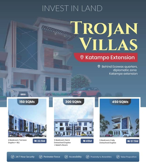 Experience the elegance of modern living at Trojan Villas, a premium residential development strategically located in the prestigious Katampe Extension. Nestled behind Ecowas Quarters within the diplomatic zone, this estate offers an exceptional blend of class, comfort, and convenience — ideal for families, professionals, and investors.